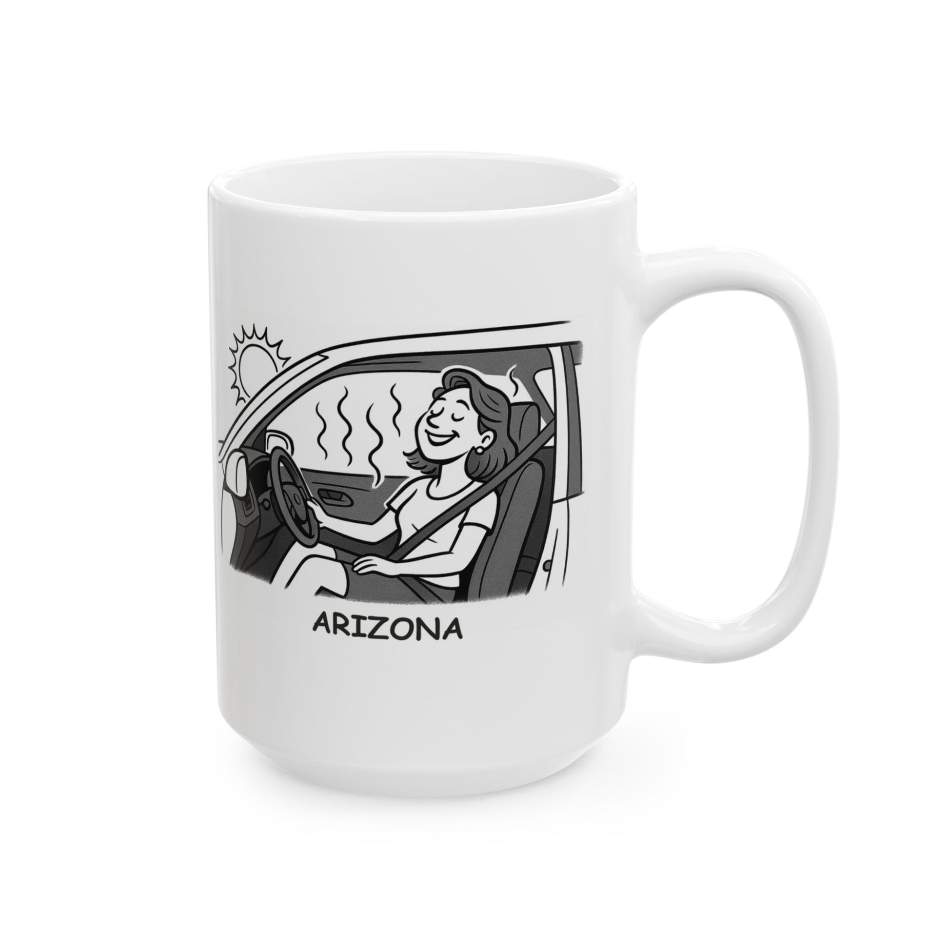 If you've ever opened your car door and been hit with a heatwave—then smiled anyway—you’re definitely in Arizona. This funny and relatable ceramic mug captures the unique love-hate relationship with desert driving. Made from durable ceramic and available in 11oz and 15oz sizes, it’s perfect for those who embrace the sizzle and sip their coffee with pride.