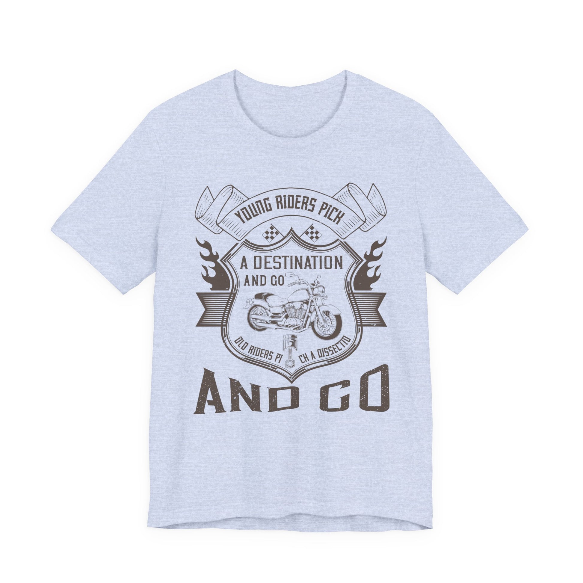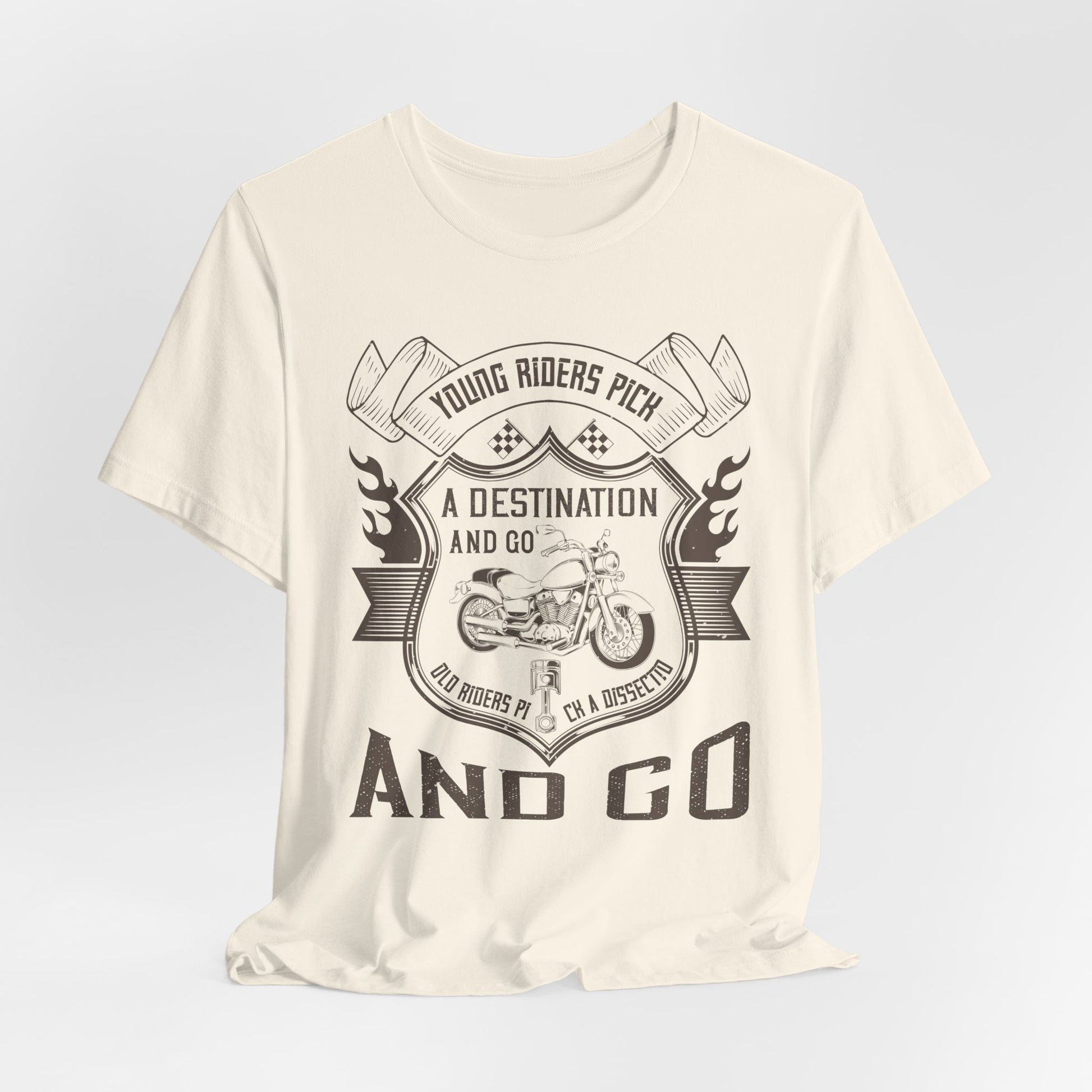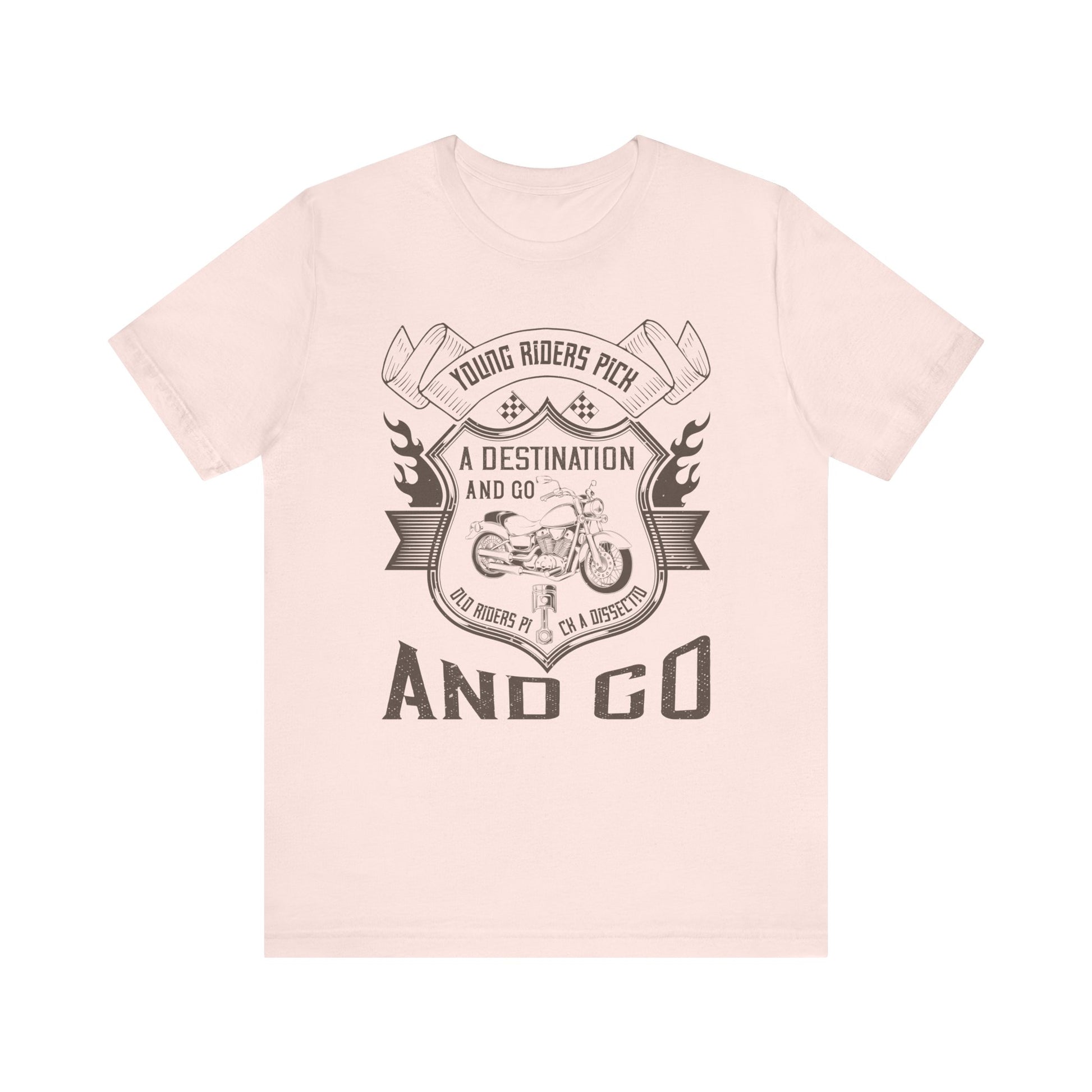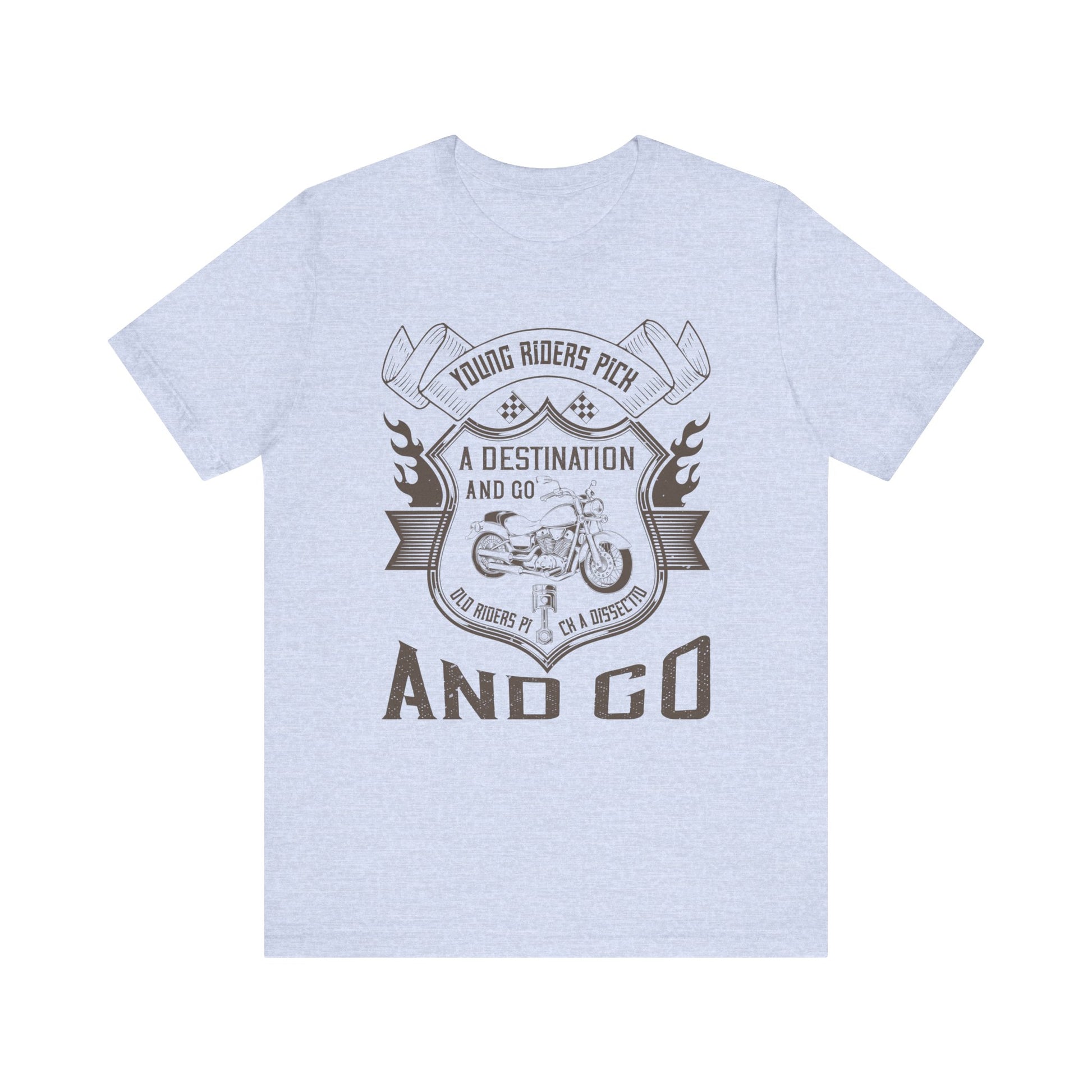 Hit the road in style and humor with the Young Riders Pick a Destination and Go, Old Riders Pick a Dissection and Go Unisex Jersey Short Sleeve Tee. Let this shirt remind you that every ride is a unique experience, no matter your age or riding style!