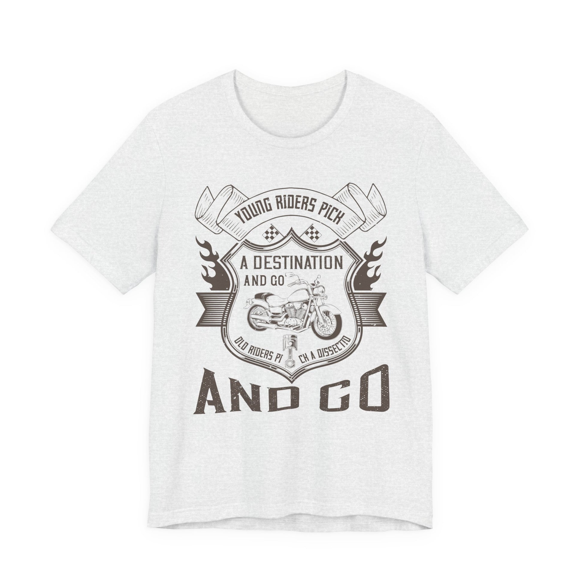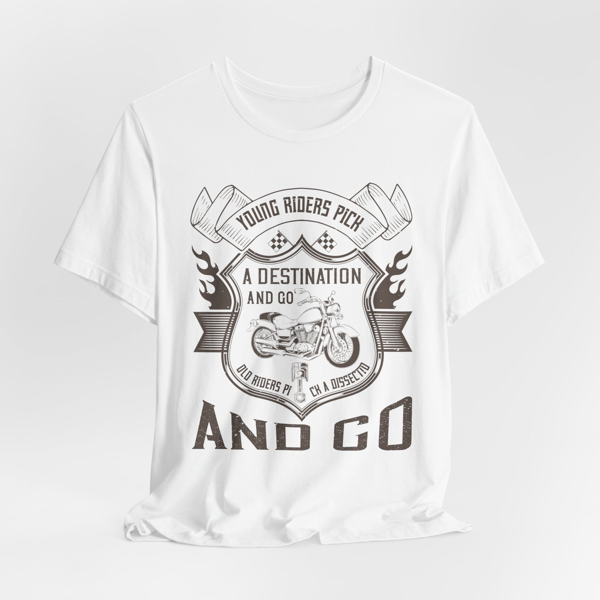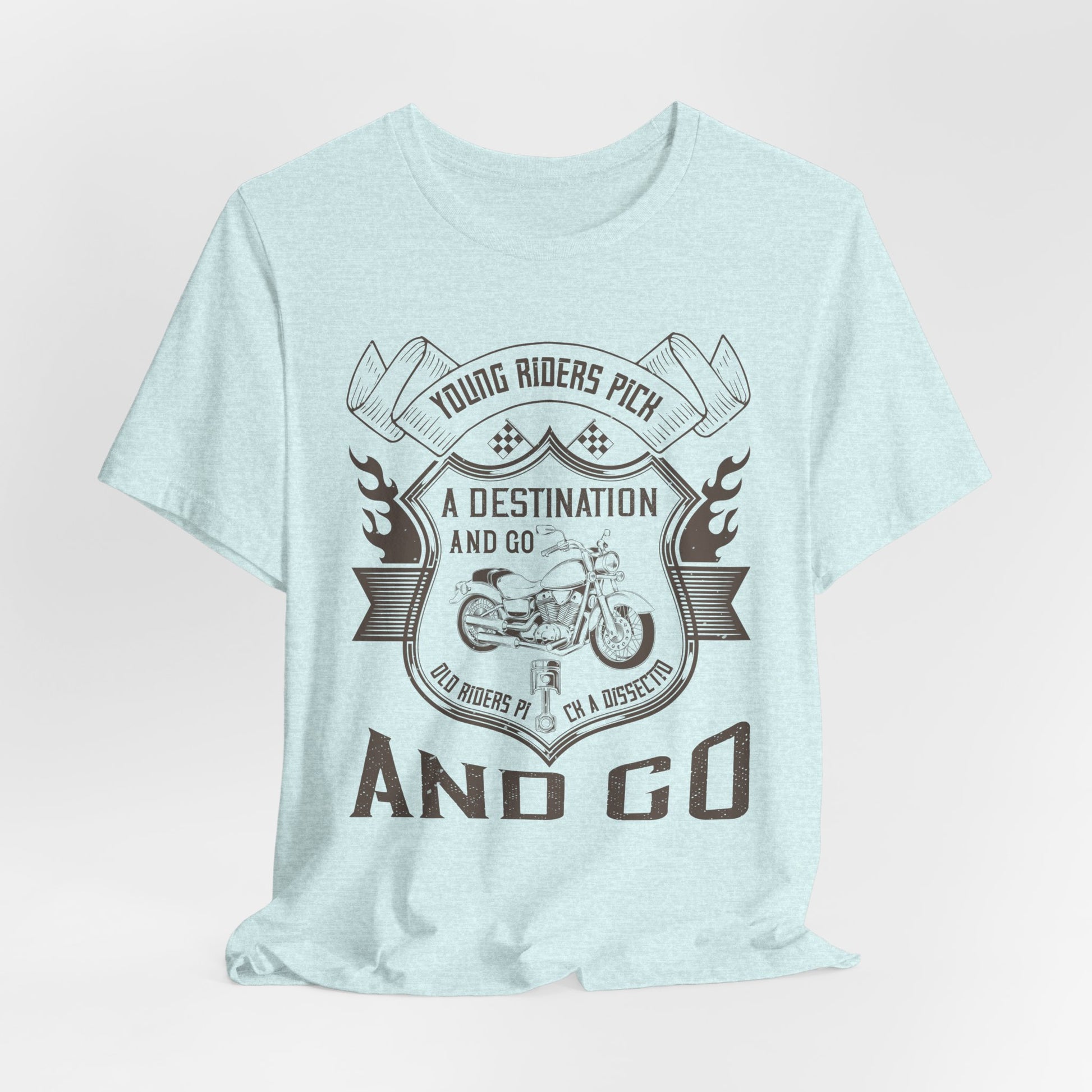 Hit the road in style and humor with the Young Riders Pick a Destination and Go, Old Riders Pick a Dissection and Go Unisex Jersey Short Sleeve Tee. Let this shirt remind you that every ride is a unique experience, no matter your age or riding style!