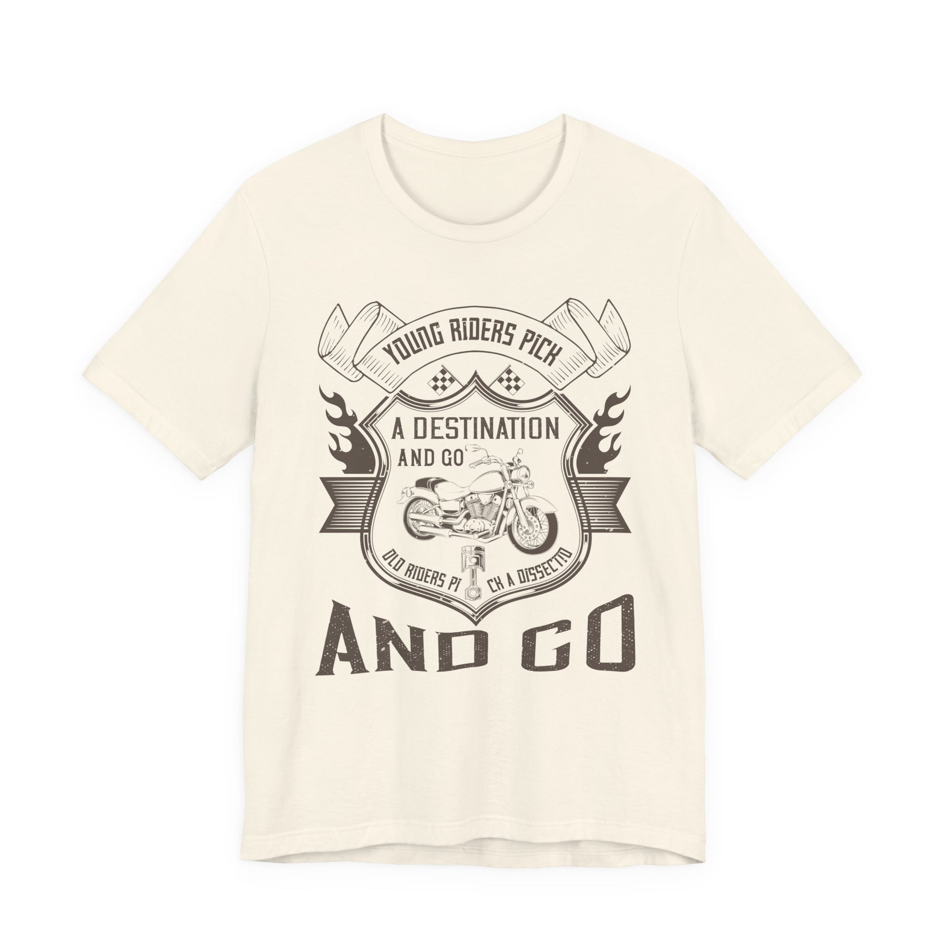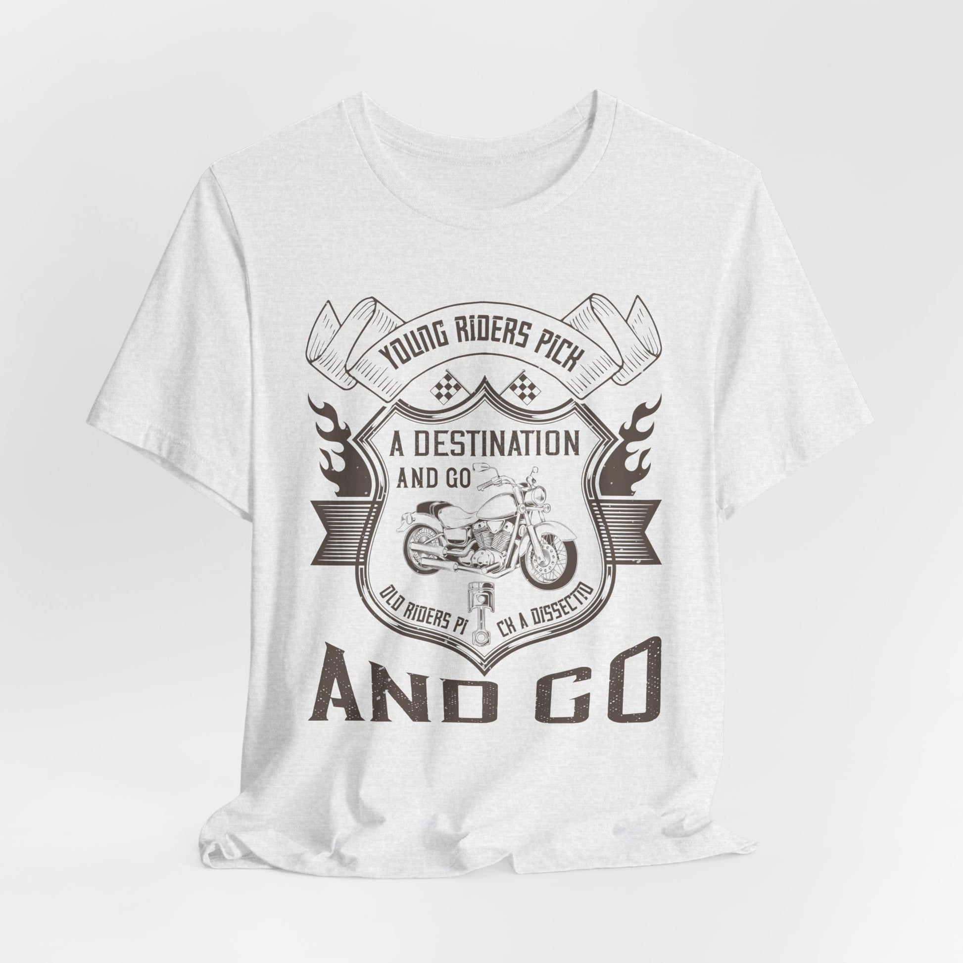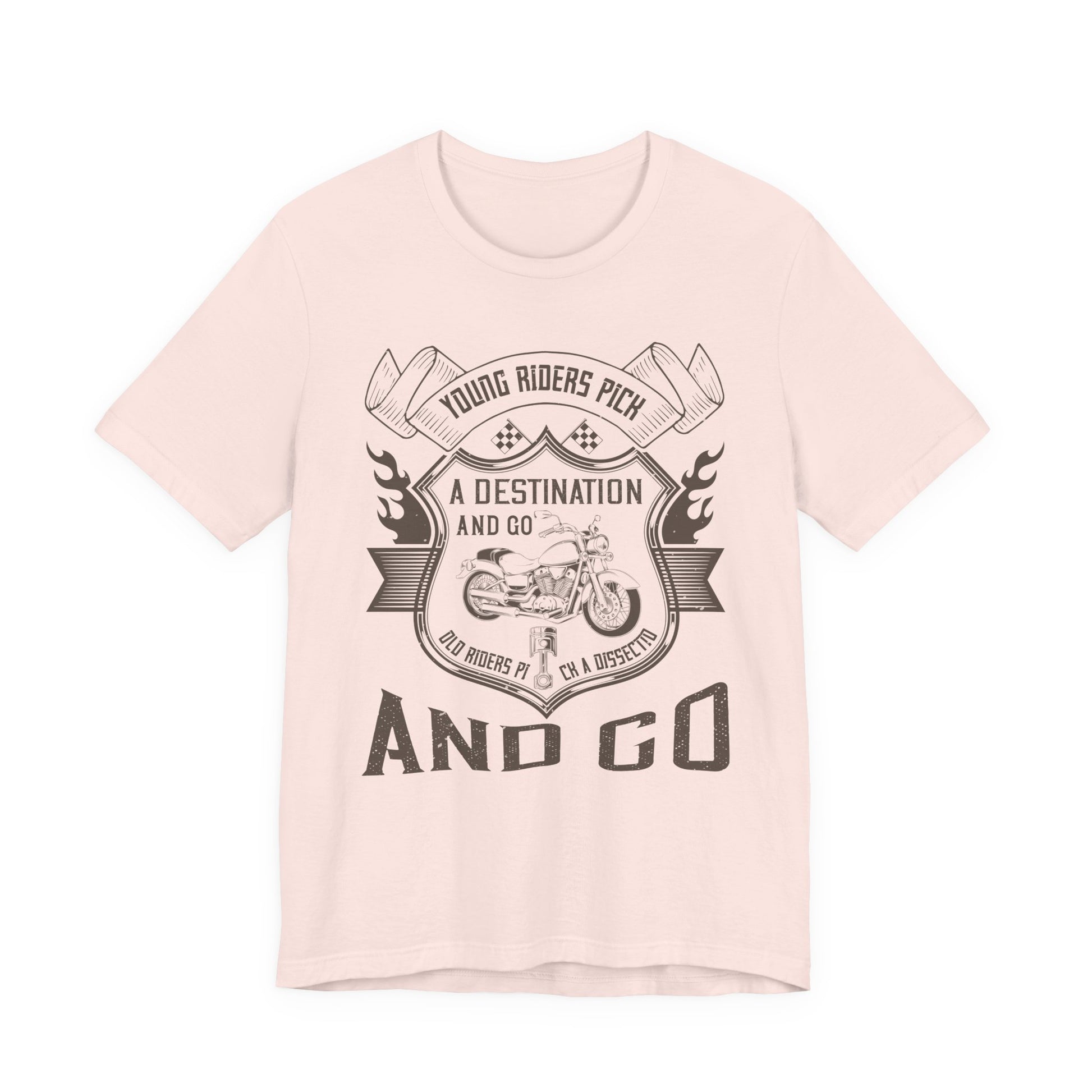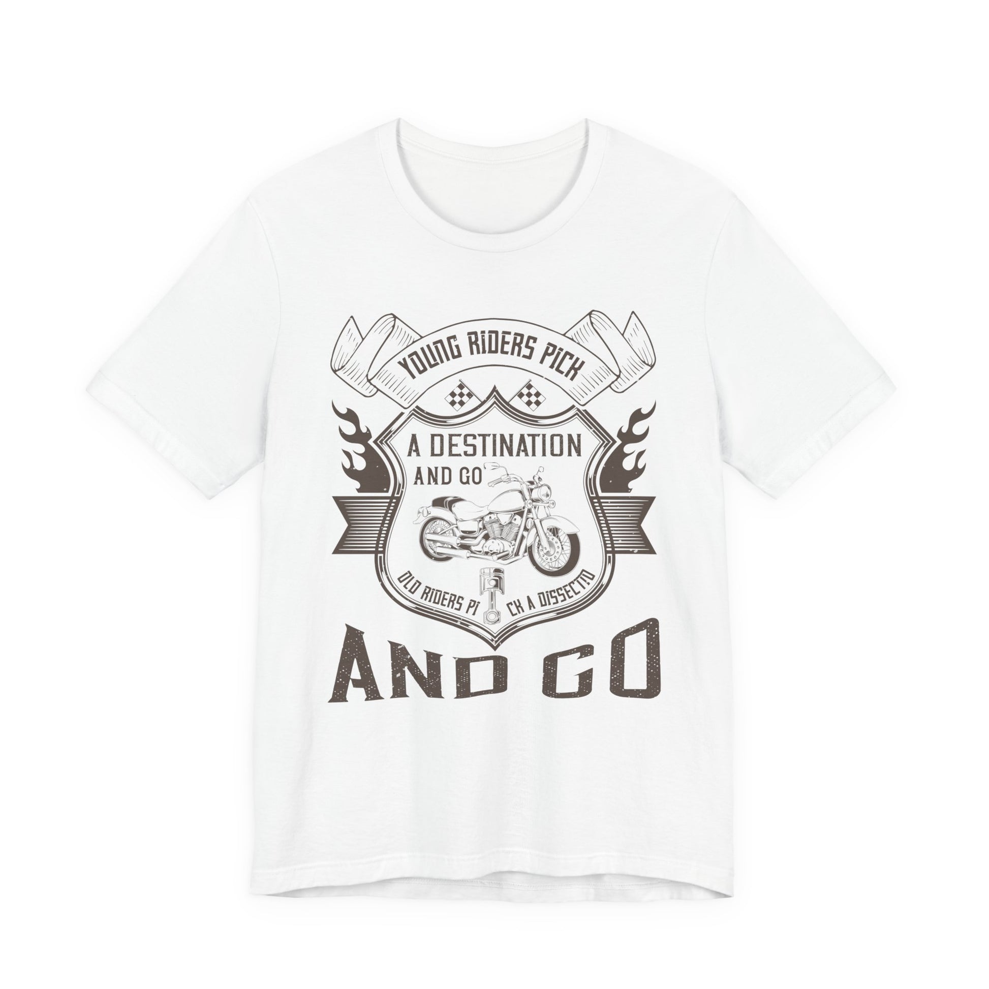 Hit the road in style and humor with the Young Riders Pick a Destination and Go, Old Riders Pick a Dissection and Go Unisex Jersey Short Sleeve Tee. Let this shirt remind you that every ride is a unique experience, no matter your age or riding style!
